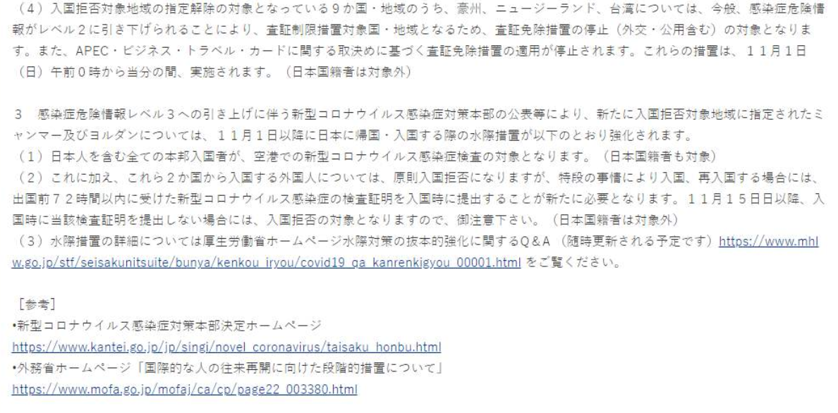 日本外相茂木敏充在10月30日內閣會議后的記者會上宣布,已對中國、韓國、越南、澳大利亞、新加坡、泰國、新西蘭、文萊等9個國家和地區解除渡航中止勸告(中止旅行警告)。針對這些地區的傳染病危險信息級別由3級下調到2級(克制不緊急不必要的渡航)。