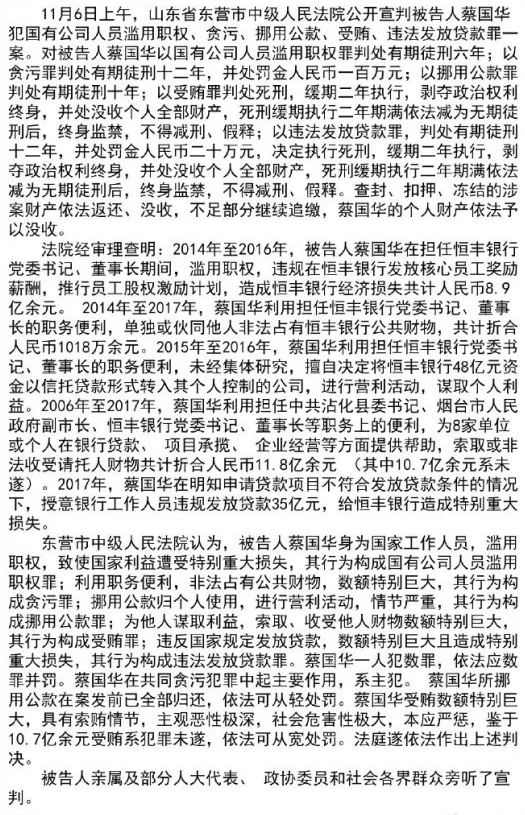 近日,恒豐銀行原董事長蔡國華犯國有公司人員濫用職權、貪污、挪用公款、受賄、違法發放貸款罪一案一審公開宣判。