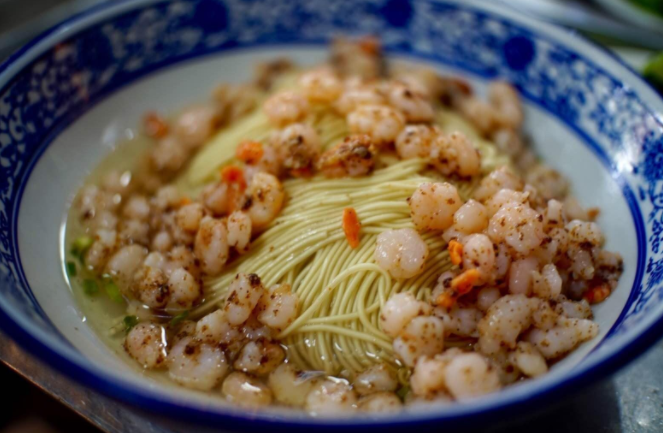 三蝦面,就是把蝦子、蝦腦、蝦仁三種蝦身上最好的東西,經(jīng)過烹飪,作成澆頭,其制作過程很繁瑣,味道真是鮮得眉毛掉下來。在蘇式湯面中,三蝦面屬于比較高大上的吃法,每年夏天的時候上市,僅有限的幾個面館供應(yīng)(如裕興記),而且價格不菲。